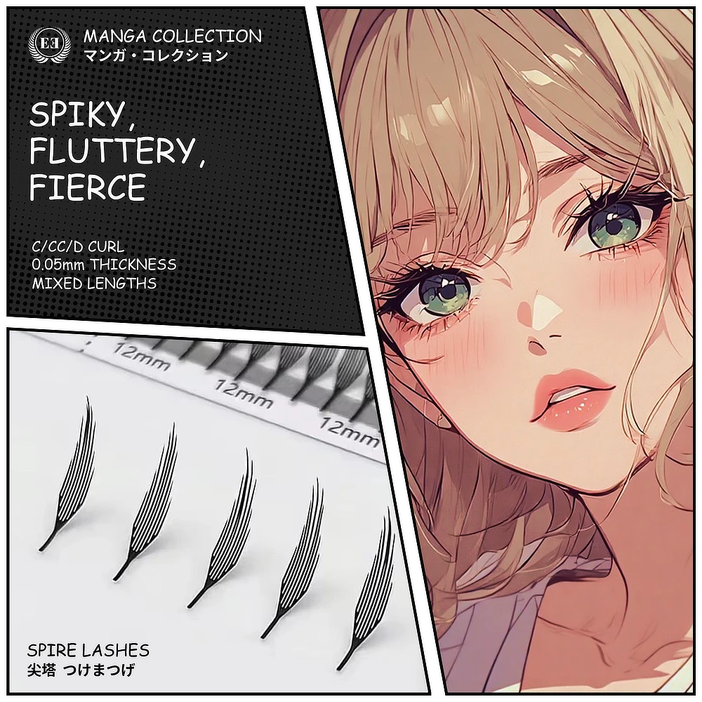 Spire Manga Lashes – 0.05mm – Anime/Manga Style, Pre-Spiked Volume/Hybrid Lashes